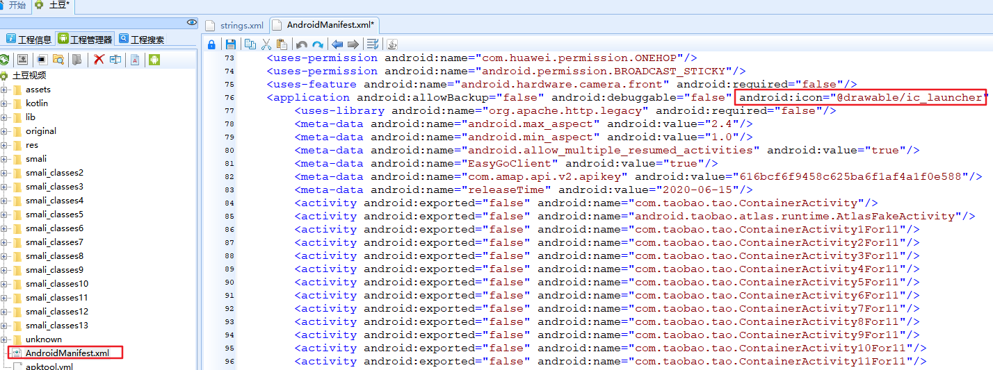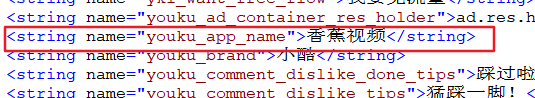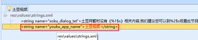 到这可以发下,有一个string标签,里面的内容是土豆视频,猜测,应该将这个修改,就能修改app的名字。