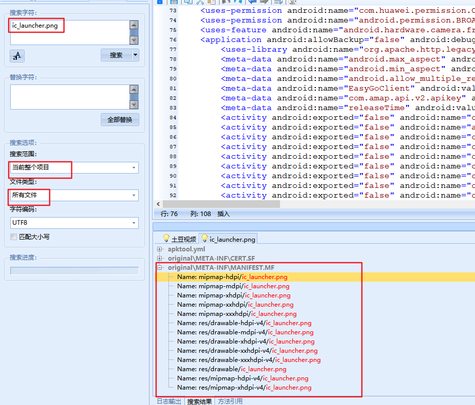 既然确定ic_launcher.png这个图片是app图标图片,那还是老规矩,全局搜索一下。