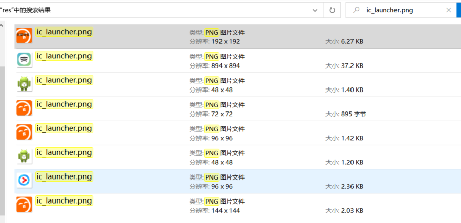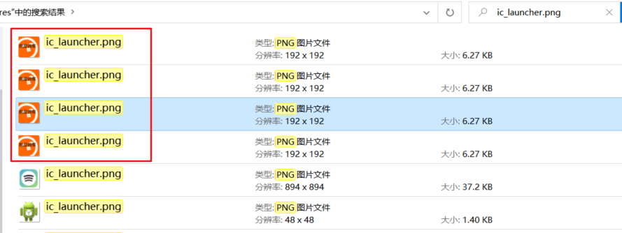经过漫长的等待,终于搜索到了有关ic_launcher.png的身影,但是这么多图片啊…,哪一个是?