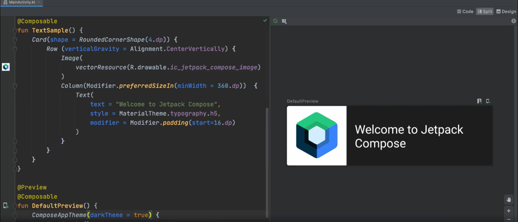 在以前 View 视图模式下,我们编写视图都是在 XML 文件中去书写,在 Jetpack Compose 中我们都用被加上 @Composable 注解的 kotlin 函数来构建界面,如下代码所示