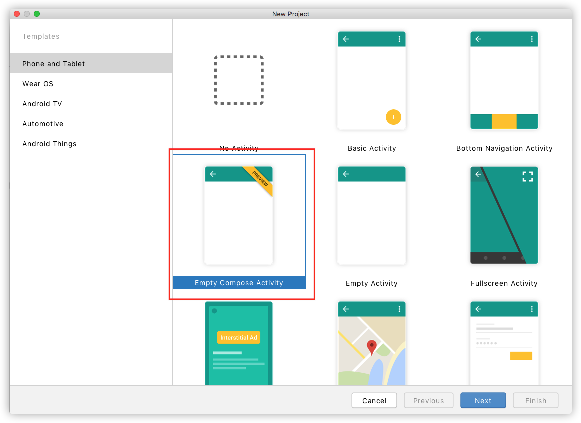 打开最新 Canary 版的 Android studio 预览版,创建一个新项目,你会发现创建新项目模板有一个 Empty Compose Activity 的模板,选择它创建一个项目就可以体验 Jetpack Compose 了。
