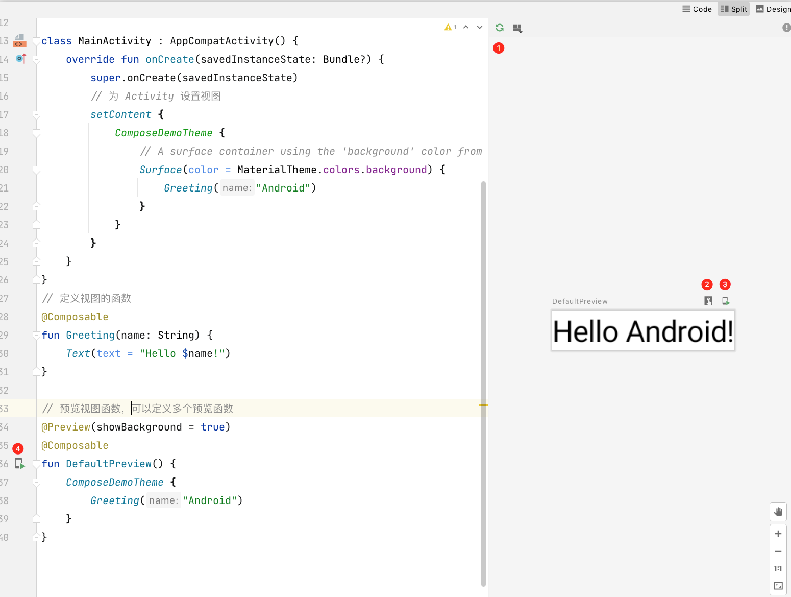 - 可组合函数只能在其他可组合函数中调用,这一点有点类似协程 suspend 函数。