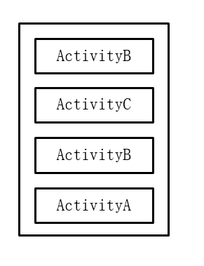 假设现在在activityb中启动activitya,会在当前栈中是否有activitya,若有则将activitya移到栈内,将位于activitya之上的移出栈顶,那么现在栈为:
