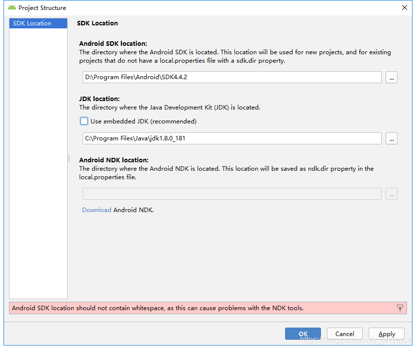 问题二:android sdk location should not contain whitespace, as this can cause problems with the ndk tools.