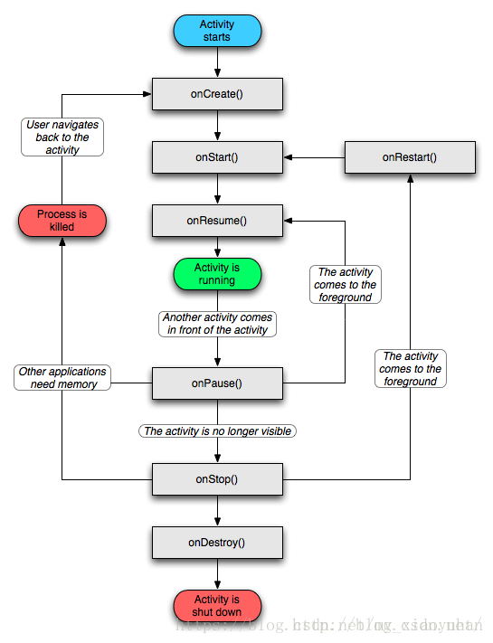 - 但处于 paused, stopped 状态的 Activity 可能会被系统杀掉,从而用户重新打开时,与当时提出时不一样了。为了保证能够还原现场,则需要实现 onSaveInstanceState() 回调方法。
