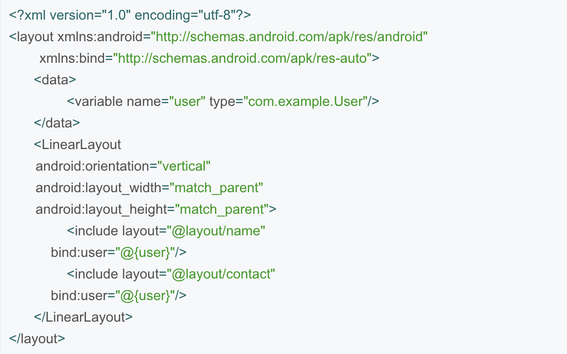 1.在使用了 app 命名空间的布局中,可以将变量传递到include布局的绑定中,以下示例显示了将user变量传递到name.xml和contact.xml布局文件中(前提是name.xml和contact.xml布局中声明了user变量):