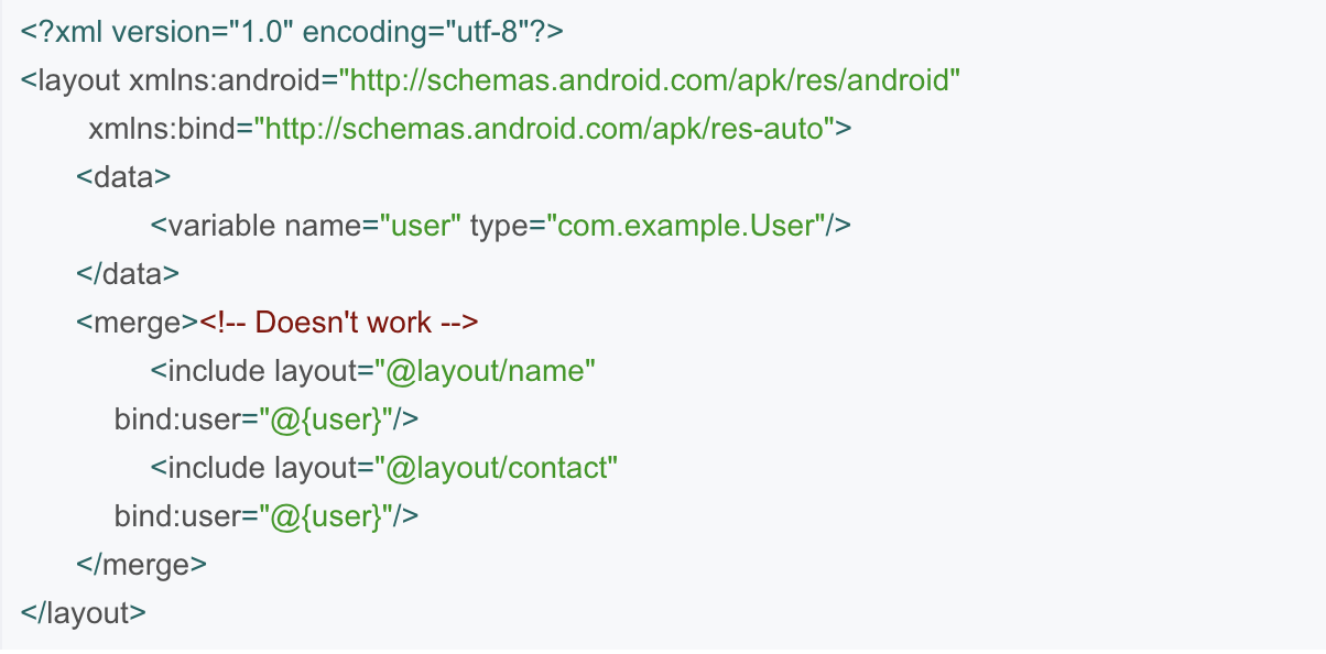 2.数据绑定不支持 include直接作为merge的子元素,根布局必须是ViewGroup,换句话说,外层必须要有LinearLayout、RelativeLayout等像这样的容器裹着,才不会出现生成的某些view被覆盖的问题出现。例如,不支持以下布局:
