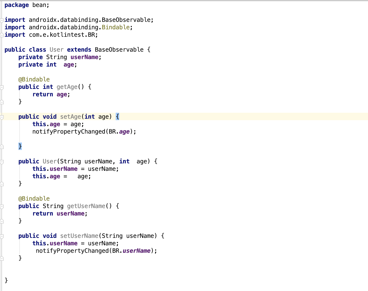 Observable是个接口,Google为我们提供了一个BaseObservable类,我们只要把Model类继承自它,就获得了通知UI更新数据的能力了,然后再getter方法上添加Bindable注解,在setter方法中使用notifying提醒UI更新数据。如:
