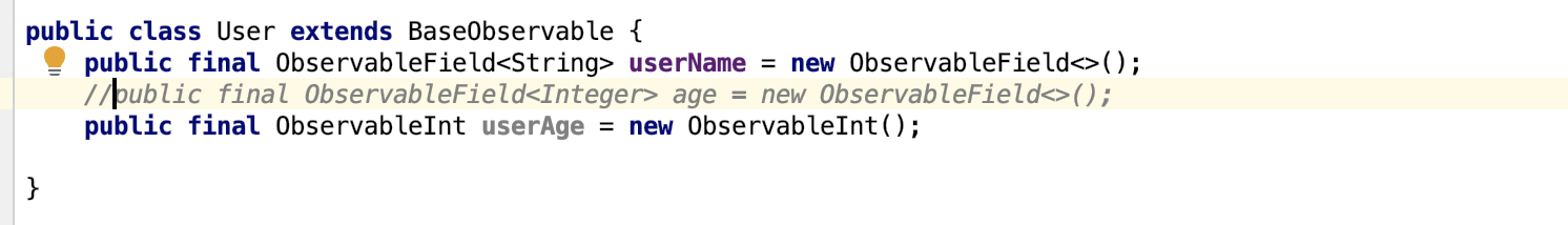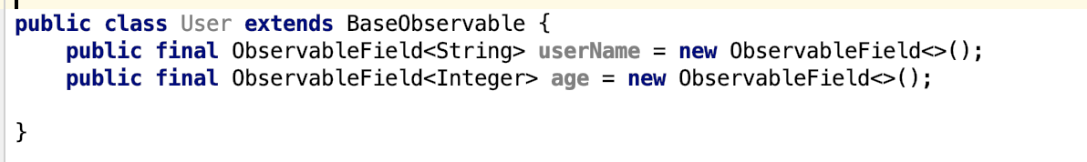 Google也推出ObservableFields类,使用它我们可以简化我们的Model类,如:
