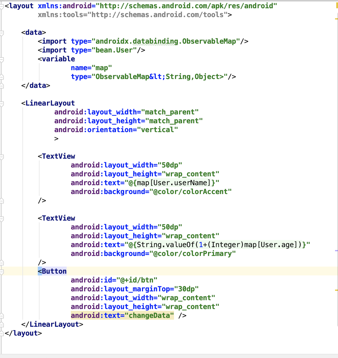 我们在layout中的区域导入包后就可以直接用它了,当它内部的数据发生改变时就自动会通知UI界面更新。如: