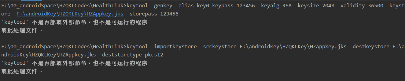 网上找了好多方式,大多都是复制报错双引号中的部分到项目所在的目录下去执行命令或者是将其修改为:keytool -genkey -alias key0-keypass 123456 -keyalg RSA -keysize 2048 -validity 36500 -keystore? F:\androidKey\HZQKLKey\HZAppkey.jks -storepass 123456在执行;又或者是把执行命令的路径改到C盘路径的? .android 路径下去执行。然而,我的执行结果是“keytool不是内部或外部命令”。也可能是我的JDK环境没有配置正确(应为现在AS自带有JDK,不需要单独配置,所以在环境配置路径指向的时候没有指向AS工具下的jre这里的缘故吧)。