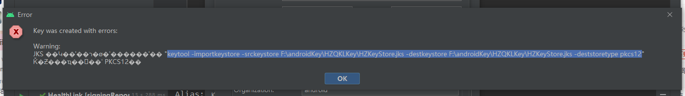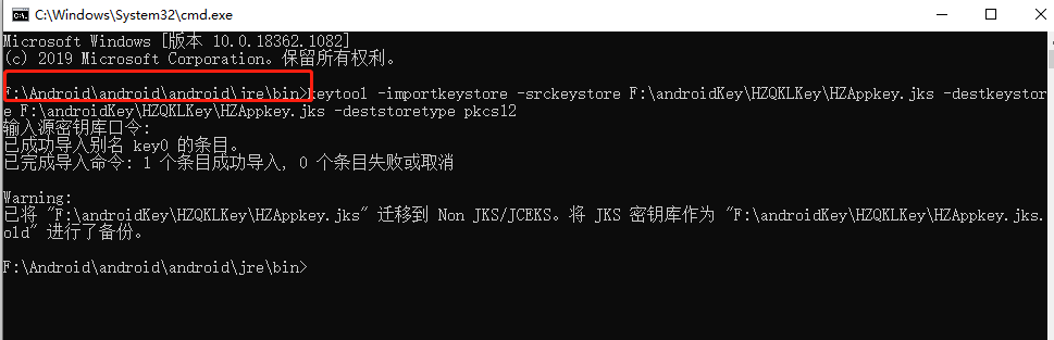 标记部分:keytool -importkeystore -srckeystore F:\androidKey\HZQKLKey\HZKeyStore.jks -destkeystore F:\androidKey\HZQKLKey\HZKeyStore.jks -deststoretype pkcs12