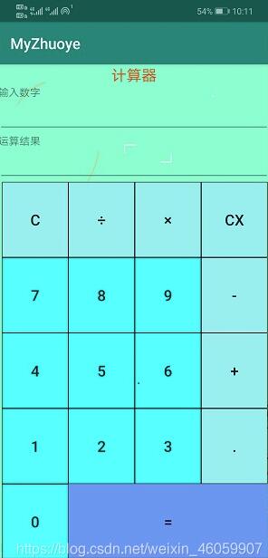 <?xml version="1.0" encoding="utf-8"?> <linearlayout xmlns:android="http://schemas.android.com/apk/res/android" android:layout_width="match_parent" android:layout_height="match_parent" android:orientation="vertical" android:background="@drawable/jsj1"> <textview android:layout_width="match_parent" android:layout_height="wrap_content" android:text="计算器" android:textsize="20dp" android:gravity="center" android:textcolor="#ee4000"/> <textview android:layout_width="match_parent" android:layout_height="wrap_content" android:text="输入数字"/> <edittext android:id="@+id/et001" android:layout_width="match_parent" android:layout_height="wrap_content"/> <textview android:layout_width="match_parent" android:layout_height="wrap_content" android:text="运算结果"/> <edittext android:id="@+id/et002" android:layout_width="match_parent" android:layout_height="wrap_content"/> <linearlayout android:layout_width="match_parent" android:layout_height="wrap_content" android:orientation="horizontal"> <button android:layout_marginleft="5dp" android:id="@+id/btn001" android:layout_width="88dp" android:layout_height="100dp" android:text="c" android:textsize="20dp" android:padding="5dp" android:background="@drawable/qqqqqqqqqq"/> <button android:id="@+id/btn002" android:layout_width="88dp" android:layout_height="100dp" android:text="÷" android:textsize="20dp" android:padding="5dp" android:background="@drawable/qqqqqqqqqq"/> <button android:id="@+id/btn003" android:layout_width="88dp" android:layout_height="100dp" android:text="×" android:textsize="20dp" android:padding="5dp" android:background="@drawable/qqqqqqqqqq"/> <button android:id="@+id/btn004" android:layout_width="88dp" android:layout_height="100dp" android:text="cx" android:textsize="20dp" android:padding="5dp" android:background="@drawable/qqqqqqqqqq"/> </linearlayout> <linearlayout android:layout_width="match_parent" android:layout_height="wrap_content" android:orientation="horizontal"> <button android:layout_marginleft="5dp" android:id="@+id/btn005" android:layout_width="88dp" android:layout_height="100dp" android:text="7" android:textsize="20dp" android:padding="5dp" android:background="@drawable/sssssssssssssss"/> <button android:id="@+id/btn006" android:layout_width="88dp" android:layout_height="100dp" android:text="8" android:textsize="20dp" android:padding="5dp" android:background="@drawable/sssssssssssssss"/> <button android:id="@+id/btn007" android:layout_width="88dp" android:layout_height="100dp" android:text="9" android:textsize="20dp" android:padding="5dp" android:background="@drawable/sssssssssssssss"/> <button android:id="@+id/btn008" android:layout_width="88dp" android:layout_height="100dp" android:text="-" android:textsize="20dp" android:padding="5dp" android:background="@drawable/qqqqqqqqqq"/> </linearlayout> <linearlayout android:layout_width="match_parent" android:layout_height="wrap_content" android:orientation="horizontal"> <button android:layout_marginleft="5dp" android:id="@+id/btn009" android:layout_width="88dp" android:layout_height="100dp" android:text="4" android:textsize="20dp" android:padding="5dp" android:background="@drawable/sssssssssssssss"/> <button android:id="@+id/btn0010" android:layout_width="88dp" android:layout_height="100dp" android:text="5" android:textsize="20dp" android:padding="5dp" android:background="@drawable/sssssssssssssss"/> <button android:id="@+id/btn0011" android:layout_width="88dp" android:layout_height="100dp" android:text="6" android:textsize="20dp" android:padding="5dp" android:background="@drawable/sssssssssssssss"/> <button android:id="@+id/btn0012" android:layout_width="88dp" android:layout_height="100dp" android:text="+" android:textsize="20dp" android:padding="5dp" android:background="@drawable/qqqqqqqqqq"/> </linearlayout> <linearlayout android:layout_width="match_parent" android:layout_height="wrap_content" android:orientation="horizontal"> <button android:layout_marginleft="5dp" android:id="@+id/btn0013" android:layout_width="88dp" android:layout_height="100dp" android:text="1" android:textsize="20dp" android:padding="5dp" android:background="@drawable/sssssssssssssss"/> <button android:id="@+id/btn0014" android:layout_width="88dp" android:layout_height="100dp" android:text="2" android:textsize="20dp" android:padding="5dp" android:background="@drawable/sssssssssssssss"/> <button android:id="@+id/btn0015" android:layout_width="88dp" android:layout_height="100dp" android:text="3" android:textsize="20dp" android:padding="5dp" android:background="@drawable/sssssssssssssss"/> <button android:id="@+id/btn0019" android:layout_width="88dp" android:layout_height="100dp" android:text="." android:textsize="20dp" android:padding="5dp" android:background="@drawable/qqqqqqqqqq"/> </linearlayout> <linearlayout android:layout_width="match_parent" android:layout_height="wrap_content" android:orientation="horizontal"> <button android:layout_marginleft="5dp" android:id="@+id/btn0018" android:layout_width="88dp" android:layout_height="100dp" android:text="0" android:textsize="20dp" android:padding="5dp" android:background="@drawable/sssssssssssssss"/> <button android:id="@+id/btn0016" android:layout_width="265dp" android:layout_height="100dp" android:text="=" android:textsize="20dp" android:padding="5dp" android:background="#6495ed"/> </linearlayout> </linearlayout>