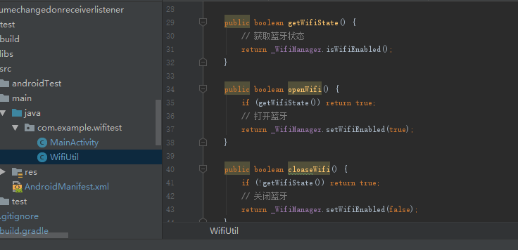 3、创建一个 WifiUtil,编写获取Wifi状态,设置Wifi状态,和监听Wifi状态变化的方法