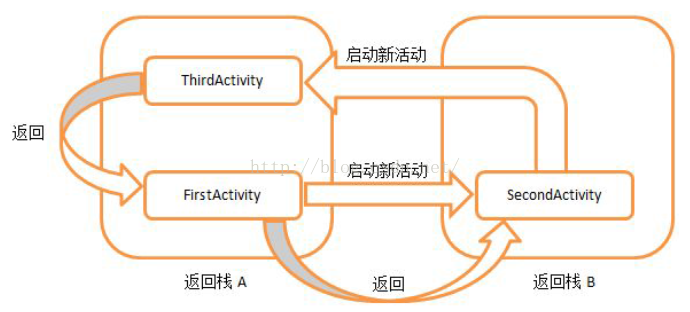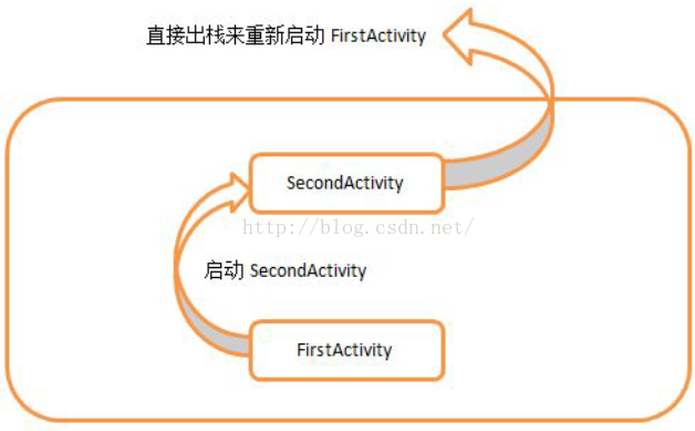 重新启动程序,你会发现你可以通过点击按钮不停的穿梭于SecondActicity和FirstActivity,这是因为FirstActivity中点击按钮时,会创建一个新的SecondActivity实例,并且此实例将位于栈顶,而点击SecondActivity中的按钮时会创建一个新的FirstActicity实例。