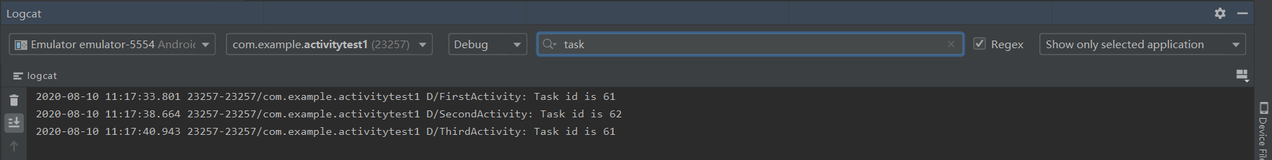 重新运行程序,依次点击按钮,在logcat中搜索关键词task就会看到如下结果:
