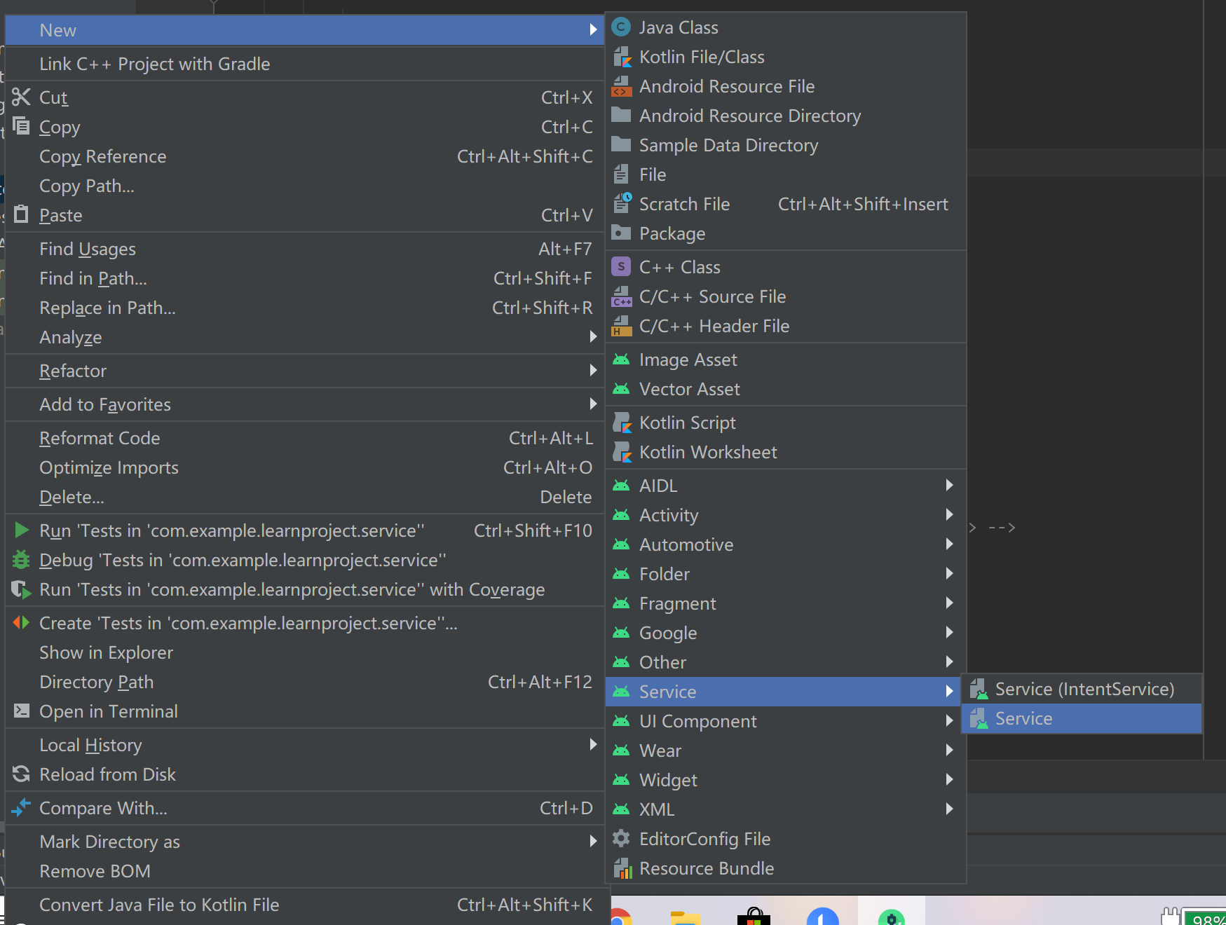 AS自动创建对应的Service类,并在AndroidManifest中进行注册: