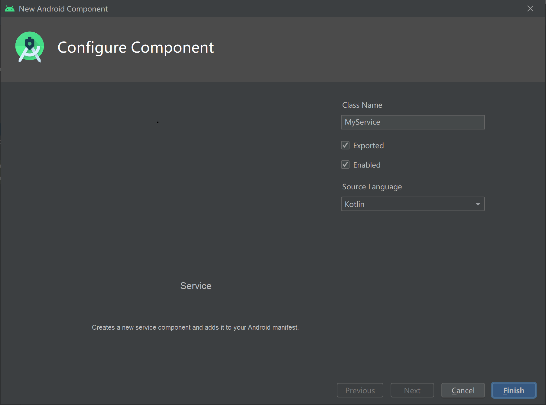 可以看到,AndroidStudio提供了service和IntentService两个选择,其实二者都是继承自Service类,不过IntentService是Service的一个子类,对其进行了一些封装,下文将对其进行简单介绍,这里我们选择Service即可。
