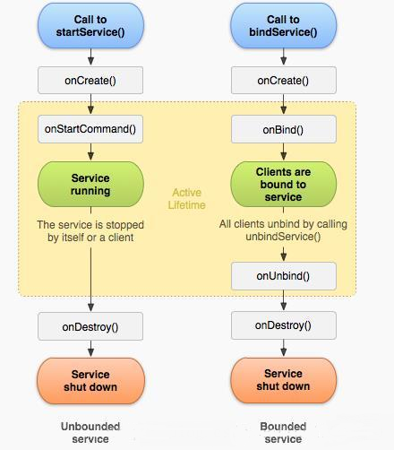 从上图可以看到,使用startService和bindService运行Service其生命周期是不同的。使用startService运行service,service在调用onCreate之后会调用onStartCommand(onStart被弃用),此后service将会一直运行下去,不依赖于任何其它组件,直到在其它地方调用了stopService或是自己调用stopSelf停止service,然后才会调用onDestroy方法继而被销毁;而bindService会在调用的Activity和Service之间创建一个绑定关系,创建后调用onBind方法,然后直到所有绑定该service的client被销毁或是主动调用unBindService解绑,service就会调用onUnBind和onDestroy方法,继而被销毁。