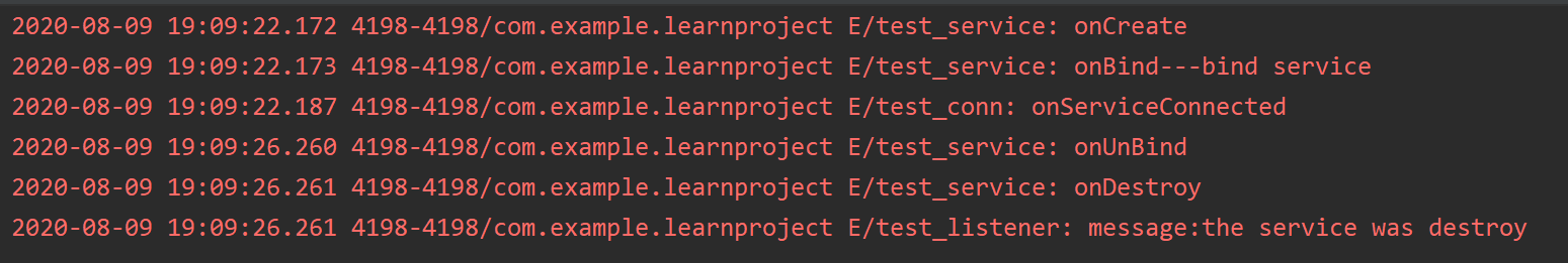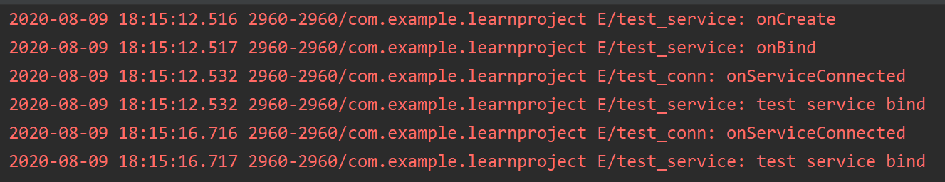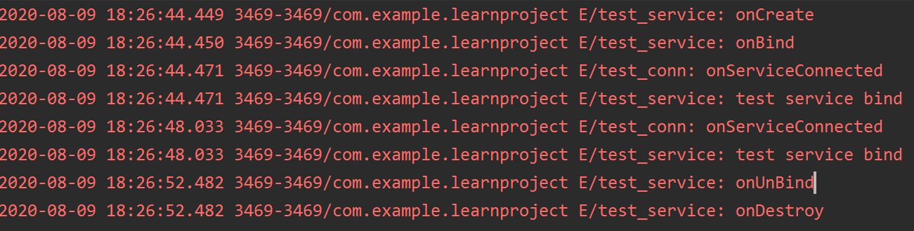 从图中,我们可以看到,调用bindService方法后,service依次调用了onCreate和onBind方法,而onStartCommand方法并没有被调用。绑定成功后,回调了serviceConnection中的onServiceConnected方法,在该方法中,我们获取到了service的实例并调用了service中的test()方法,实现了对service的交互。