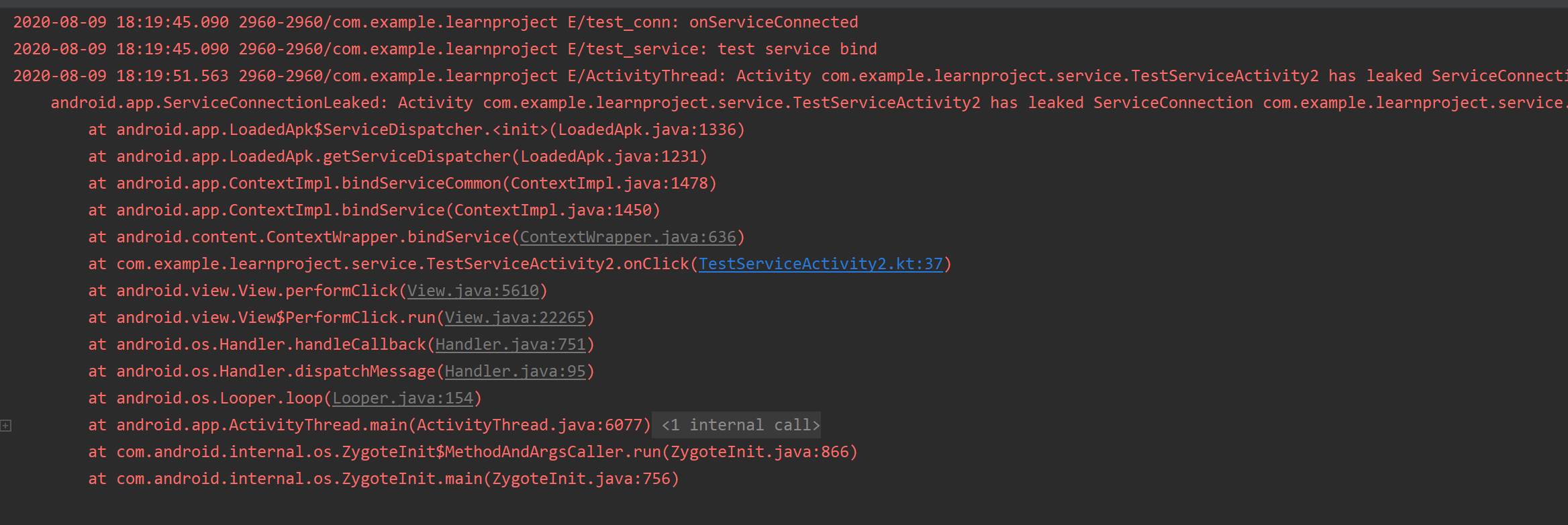 class MyServiceConnection : ServiceConnection { override fun onServiceDisconnected(p0: ComponentName?) { Log.e("test_conn", "onServiceDisconnected") } override fun onServiceConnected(p0: ComponentName?, binder: IBinder?) { Log.e("test_conn", "onServiceConnected") //根据IBinder获取service实例 val service = (binder as MyService.MyBinder).getService() service.test() } }