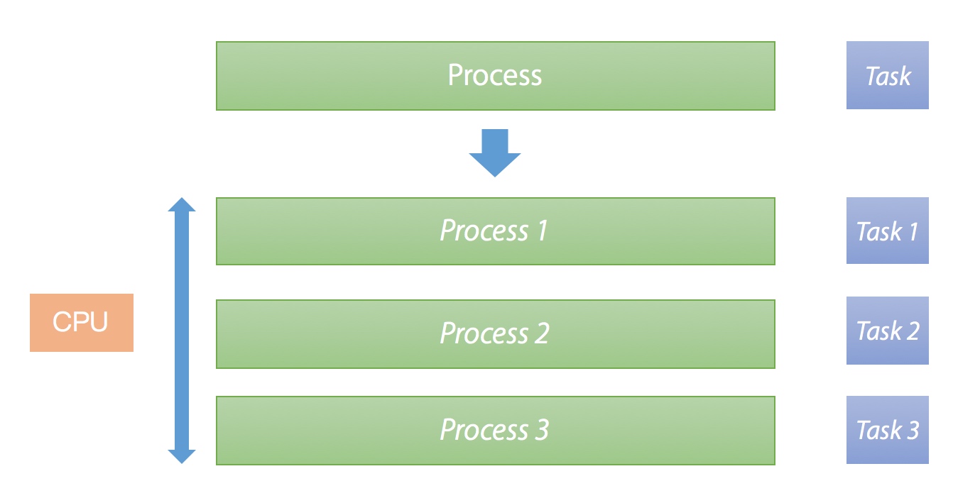 - 多进程,不改变任务执行的整体过程,在一个时间段内同时执行多个相同的代码段,调度权在 CPU,如果一个任务能独占一个 CPU 则可以实现并行。
