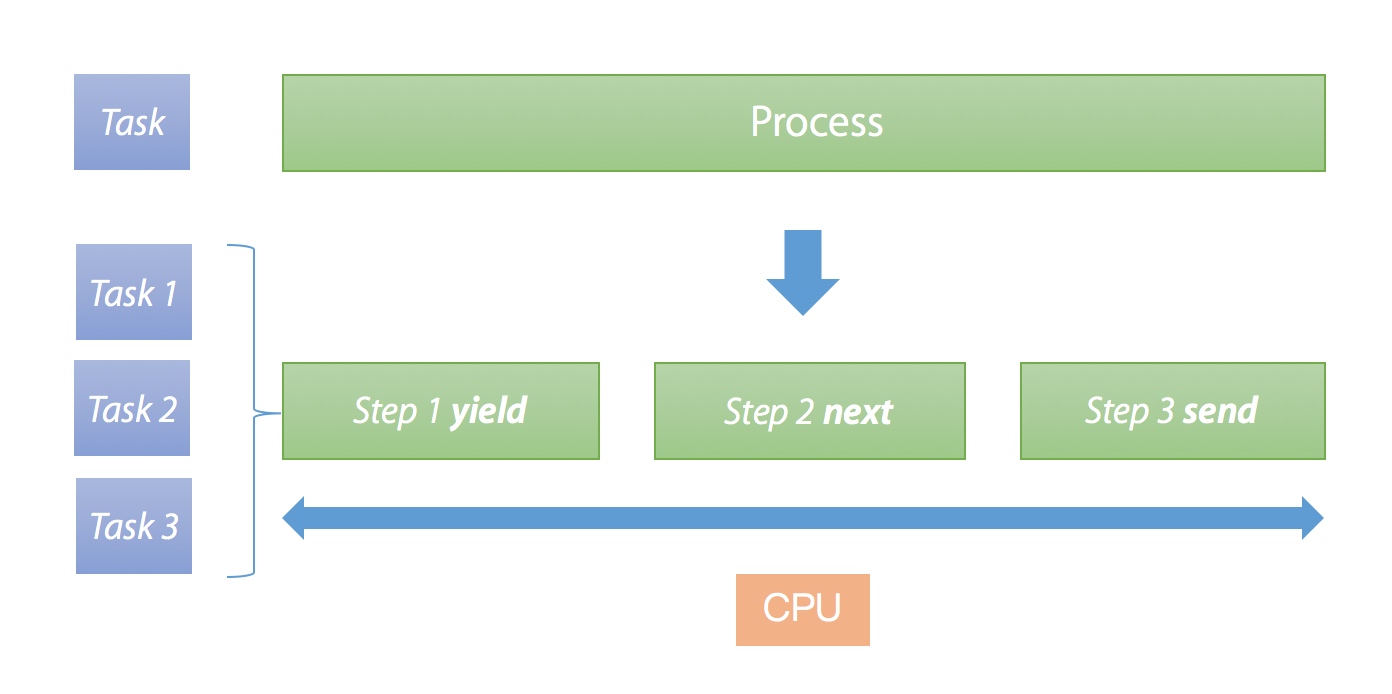 - 协程,把原有任务拆分成多个小任务,原有任务的执行流程被改变,调度权在进程自己,如果有 IO 并且可以实现异步,则可以实现并行。