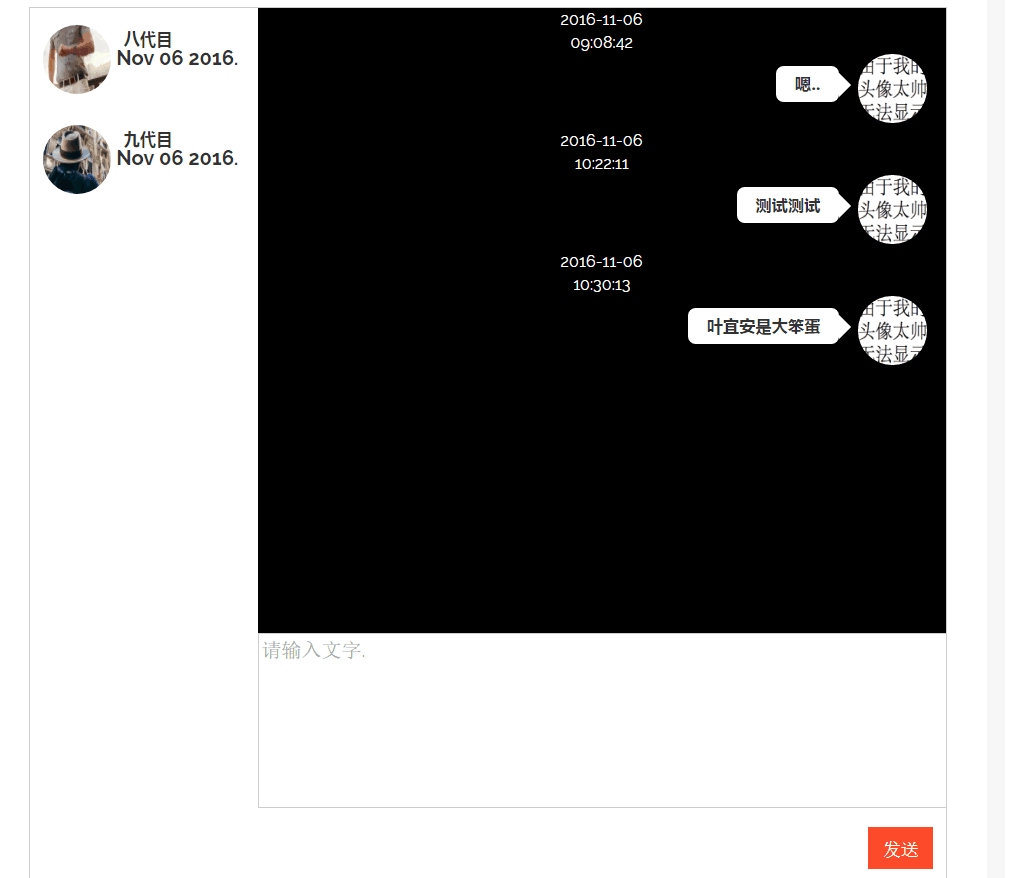 点击左侧可以切换,下方多行文本框,输入聊天信息,然后点击发送.