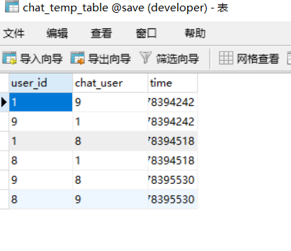 举个例子 第一个字段表示 我与id为9的用户 有一个聊天关系, 所以在'我'的界面上,就应该有这个用户. 同理 第二条字段表示 对方与我有聊天关系,那么在对方的界面上,就要有我这个用户.
