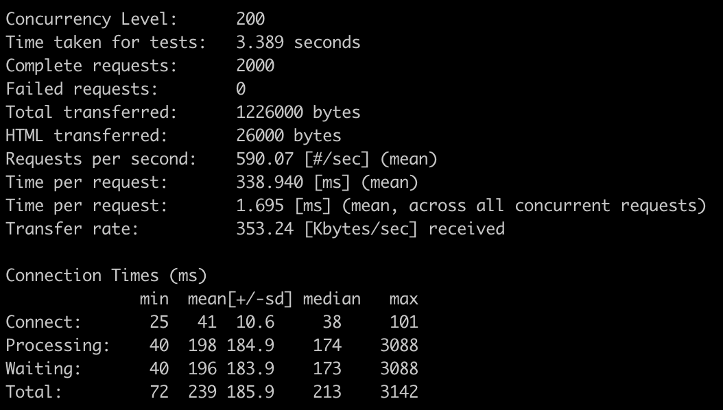 我们进行测试的内容是测试环境的一台2核4g的服务器,使用的 php 版本是 php7.4 ,正常的 nginx 及 php 配置, ulimit 也都开到了最大。代码只是简单的输出了一行文字,不过我们使用的是一个简单的 mvc 框架 ,也就是说这段代码运行起来至少也会加载几个文件,而不是简简单单的一个文件。