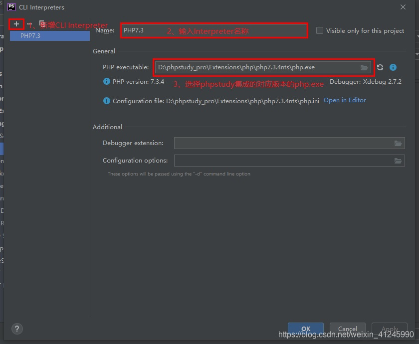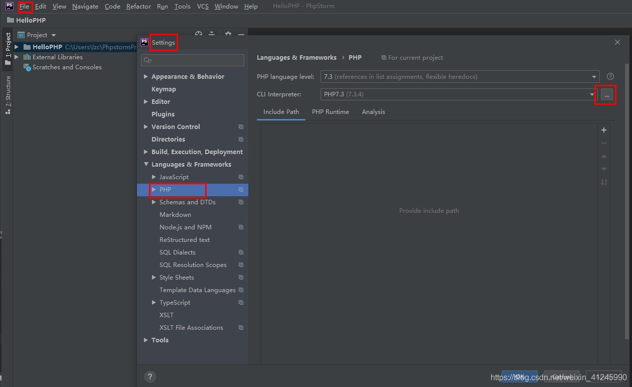 我们点击“file->settings”菜单进行php版本配置,使用和phpstudy对应的版本php7.3.4。
