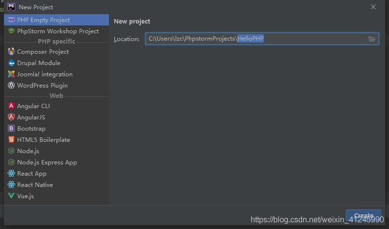 第一步:打开phpstorm软件,点击创建新项目,在输入框填写带项目存放地址的项目名称,完成后点击创建。