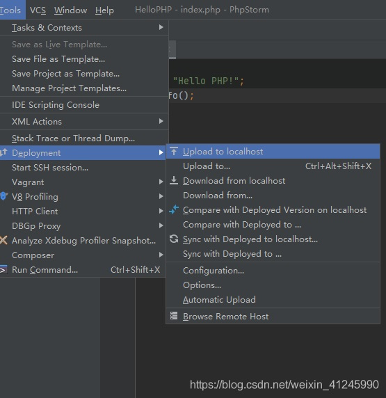 在菜单中选择tools->deployment->upload to localhost上传工程。