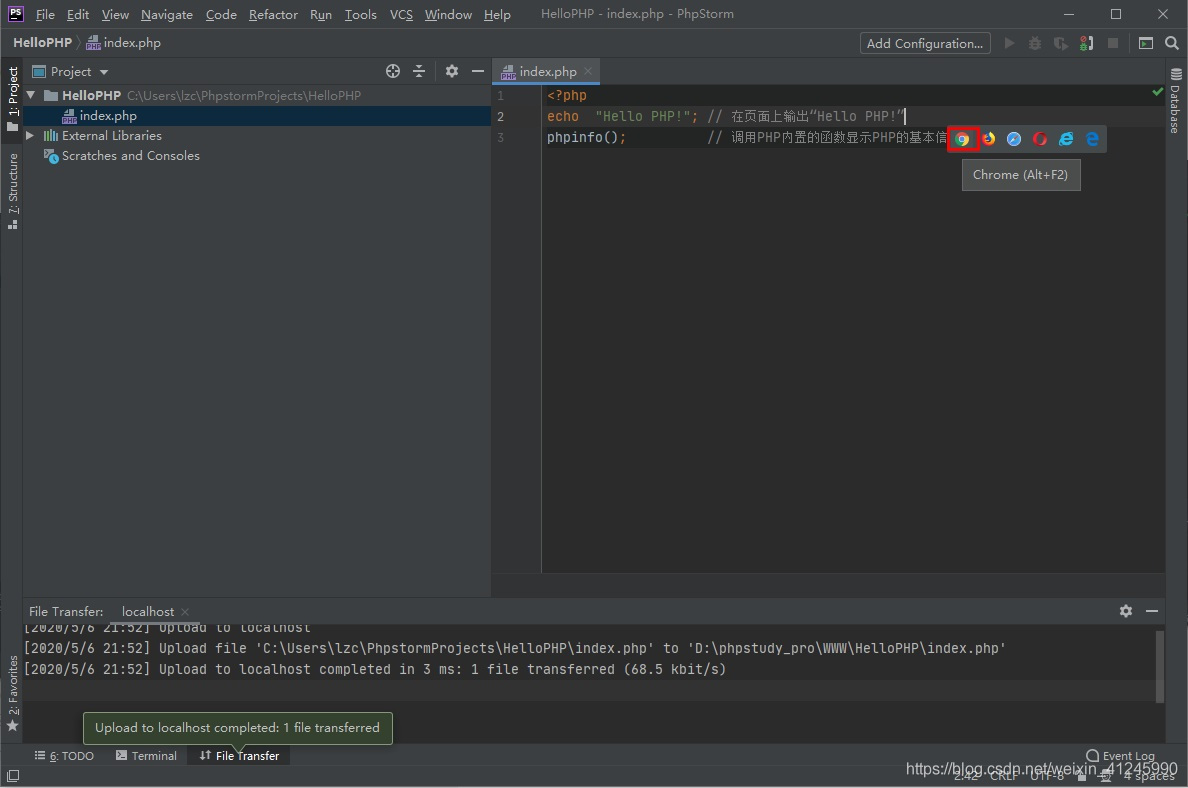 到这,我们完成了phpstudy+phpstorm配置和hellophp的运行,但是到目前为止phpstorm只是承担了编辑器和部署的功能,没法直接调试,下面我们就来完成在phpstorm进行单步调试。