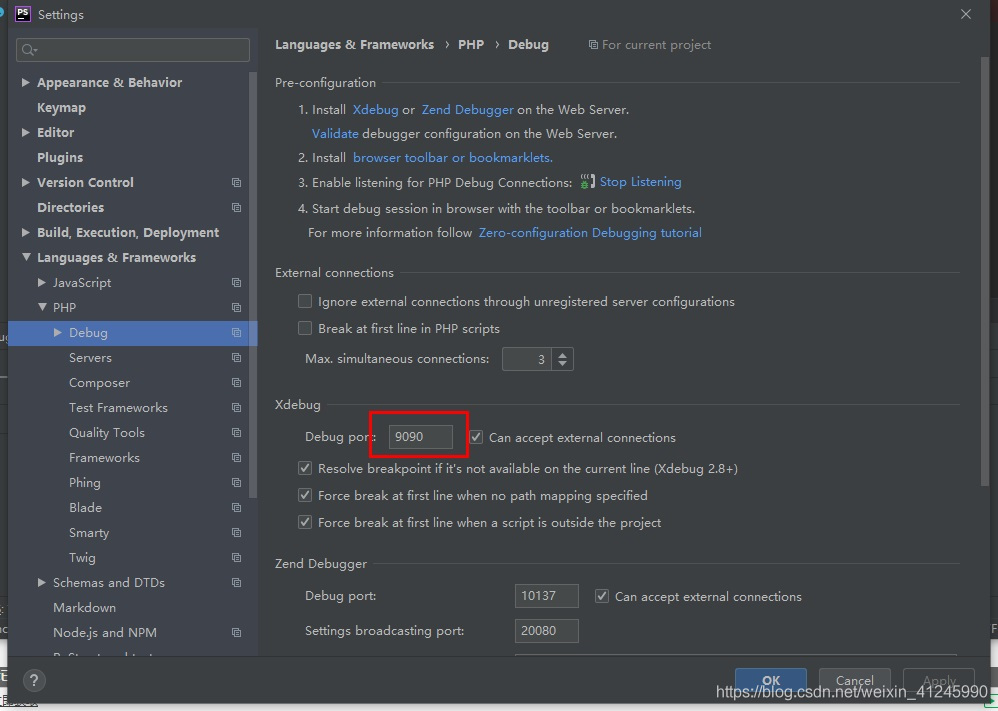 1)选择file->settings->languages&frameworks->php>debug,找到xdebug选项卡,debug port 输入的是刚刚php.ini配置文件当中xdebug.remote_port的值,具体配置如下图: