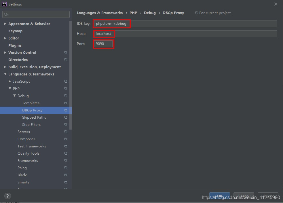 2)选择file->settings->languages&frameworks->php->debug->dbgp proxy,
