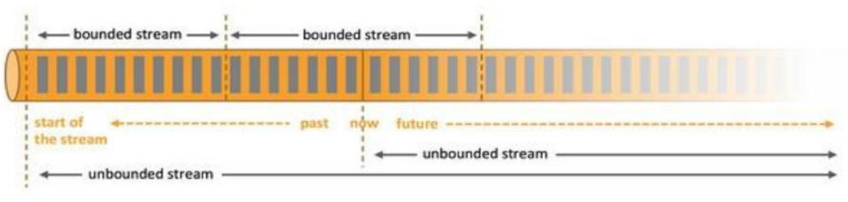 无界数据流: 无界数据流有一个开始但是没有结束, 它们不会在生成时终止并提供数 据, 必须连续处理无界流, 也就是说必须在获取后立即处理 event。