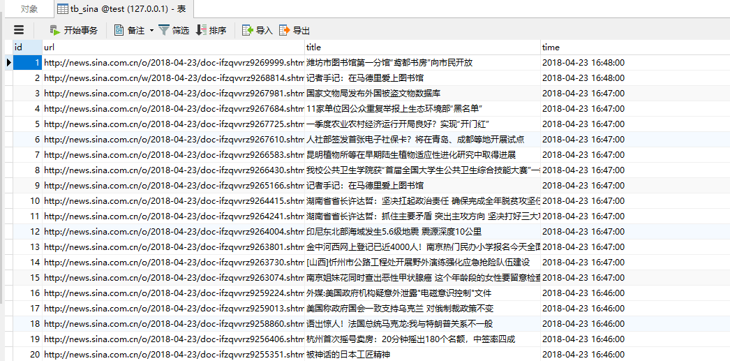 create table `tb_sina` ( `id` int(11) unsigned not null auto_increment comment 'id', `url` varchar(256) default '' comment 'url地址', `title` varchar(128) default '' comment '标题', `time` datetime default null on update current_timestamp comment '时间', primary key (`id`) ) engine=innodb default charset=utf-8 comment='sina新闻';