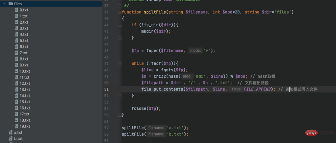 function spiltFile(string $filename, int $mod=20, string $dir='files')