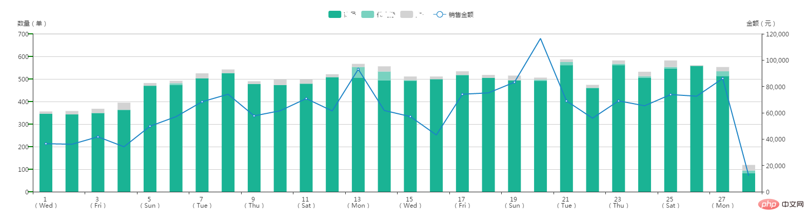 在电商平台中通常会有订单表,记录所有订单信息。现在我们需要统计某个月份每天订单数及销售金额数据从而绘制出如下统计图,进行数据分析。