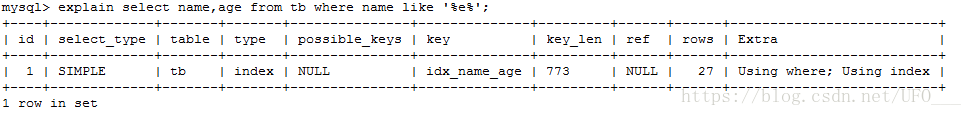 执行sql【explain select name,age from tb where name like '%e%';】