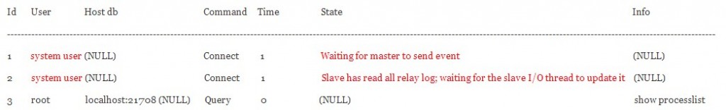 9、执行上面命令后,再执行start slave,用启动从服务器模式。 10、可以使用 show processlist 查看进程,进程状态如和下方红色内容一样的话,说明从服务器运行正常,已经连接上主服务器,开始接受并执行日志。 11、然后最好重启一下从服务器的MySQL。 12、在从服务器的MySQL控制台,使用show slave status; 命令,查看从服务器的运行状态。显示结果中以下两项都为Yes的话,那说明正常。