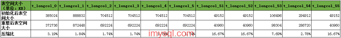上述各个测试表都写入5000行记录后,再来对比下其表空间文件大小,以及重整表空间后的大小,观察碎片率。详细对比见下: