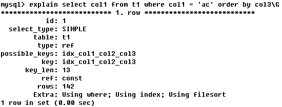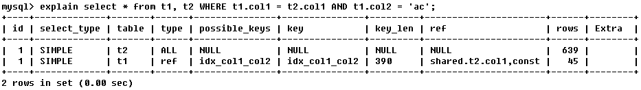 本例中,由key_len可知t1表的idx_col1_col2被充分使用,col1匹配t2表的col1,col2匹配了一个常量,即 ’ac’