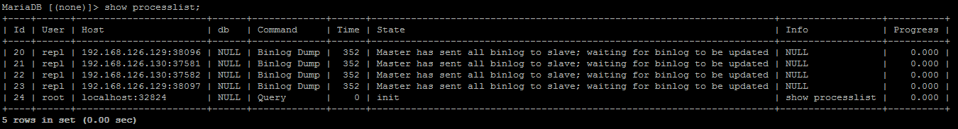 这样子就配置结束了。 3 配置好了以后主库上会有slave过来的进程: mysql>show processlist;