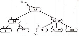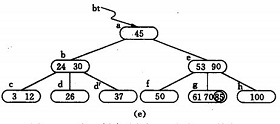[例如],在 图4.2(c)的B-树中删去关键字37之后,双亲b结点中剩余信息(“指针c”)应和其双亲*a结点中关键字45一起合并至右兄弟结点*e中,删除后的B-树如图 4.2(d)所示。 图 4.2(d)