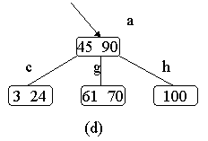 1) 首先通过查找确定插入的位置。由根*a 起进行查找,确定30应插入的在*d 节点中。由于*d 中关键字数目不超过2(即m-1),故第一个关键字插入完成:如(b)