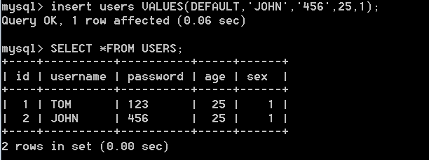 INSERT USERS VALUES(NULL,'TOM','123',25,1);