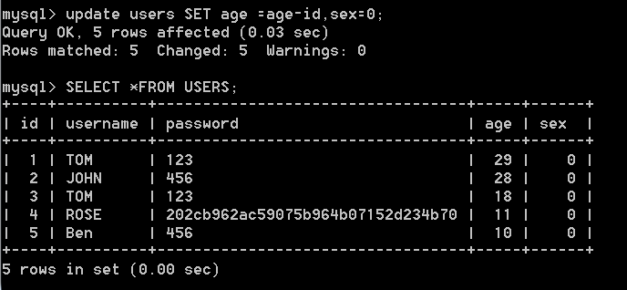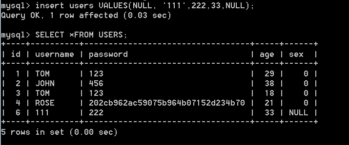 INSERT users VALUES(DEFAULT,'TOM','123',3*7-5,1),(NULL,'ROSE',MD5('123'),DEFAULT,0);