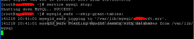 3. 重新打一个开个SSH连接(即重新打一个新的黑色窗口); 4.输入以下命令: [ root@localhost ~]# mysqlmysql>use mysql mysql>update user set password=password("123456") where user="root"; mysql>flush privileges; mysql>exit pkill -KILL -t pts/0 可将pts为0的**用户(之前运行mysqld_safe的用户窗口)强制踢出 正常启动 MySQL:service mysql start. |